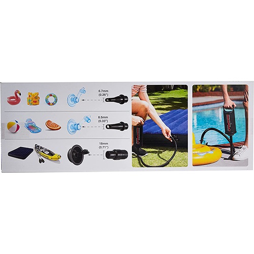پمپ باد دستی متوسط اینتکس 68614 ابعاد بزرگتری نسبت به مورد مشابه دارد و در نتیجه هوای بیشتری تولید می کند. این محصول برای انواع دستگاه های بادی مناسب بوده و به راحتی بر روی هر یک از آنها ثابت می شود. با قرار دادن پا در قسمت پایینی محصول و ثابت نگه داشتن آن روی زمین، عملکرد آن برقرار می شود. زیرا با عدم تحرک کارکرد محصول آسانتر شده و مشکلی پیش نخواهد آمد. داشتن سری های مختلف برای اتصال به بدنه محصولات بادی جهت راه اندازی یکی از مزیت های این محصول است که می تواند انواع دستگاه های بادی را راه اندازی کرده و بهترین موقعیت را برای افراد ایجاد کند. پمپ باد دستی ساده ترین و قابل استفاده است.